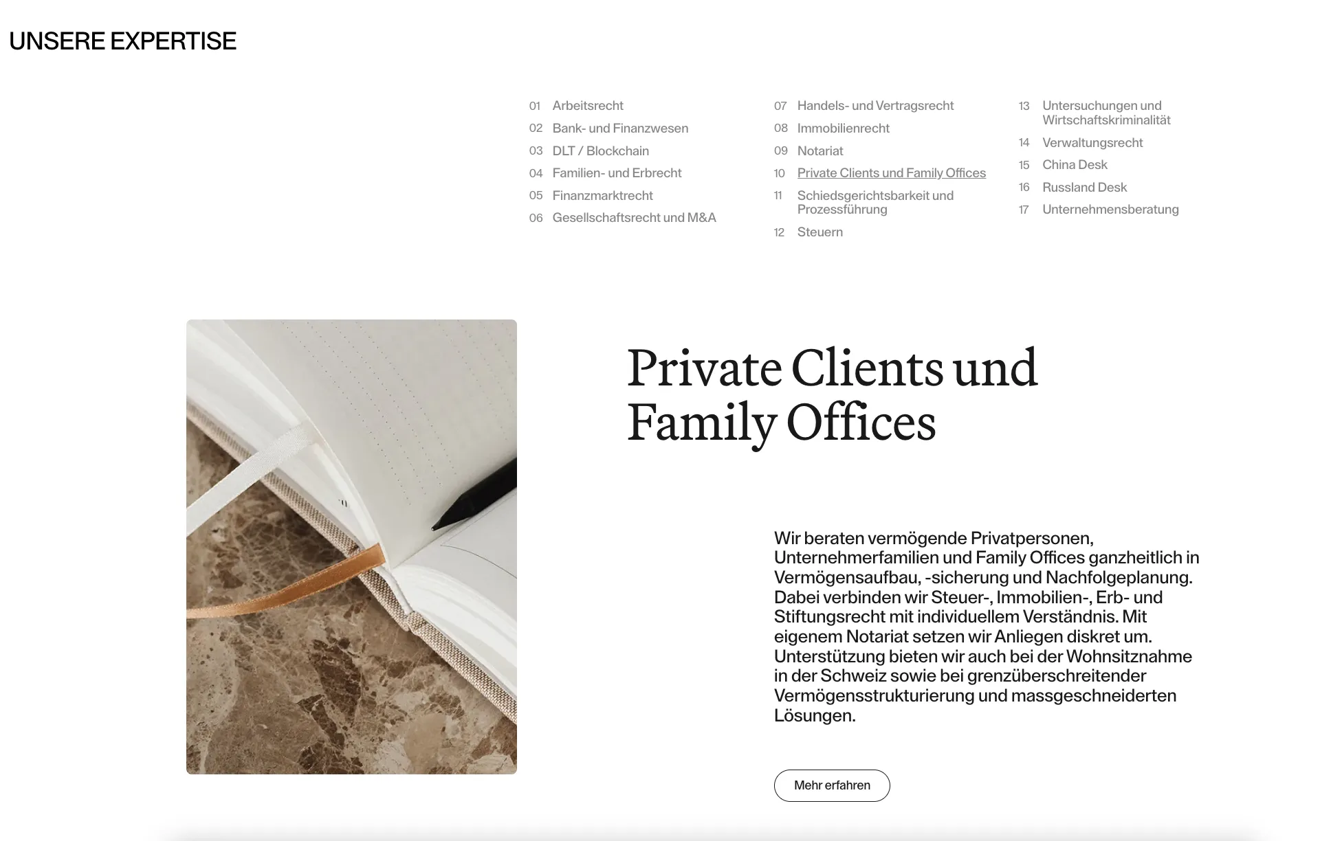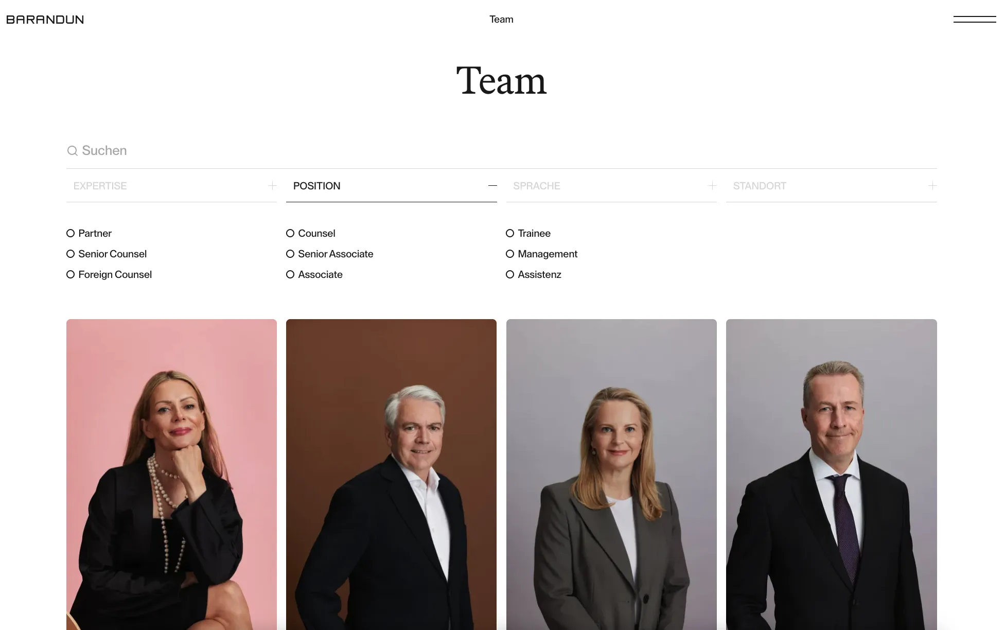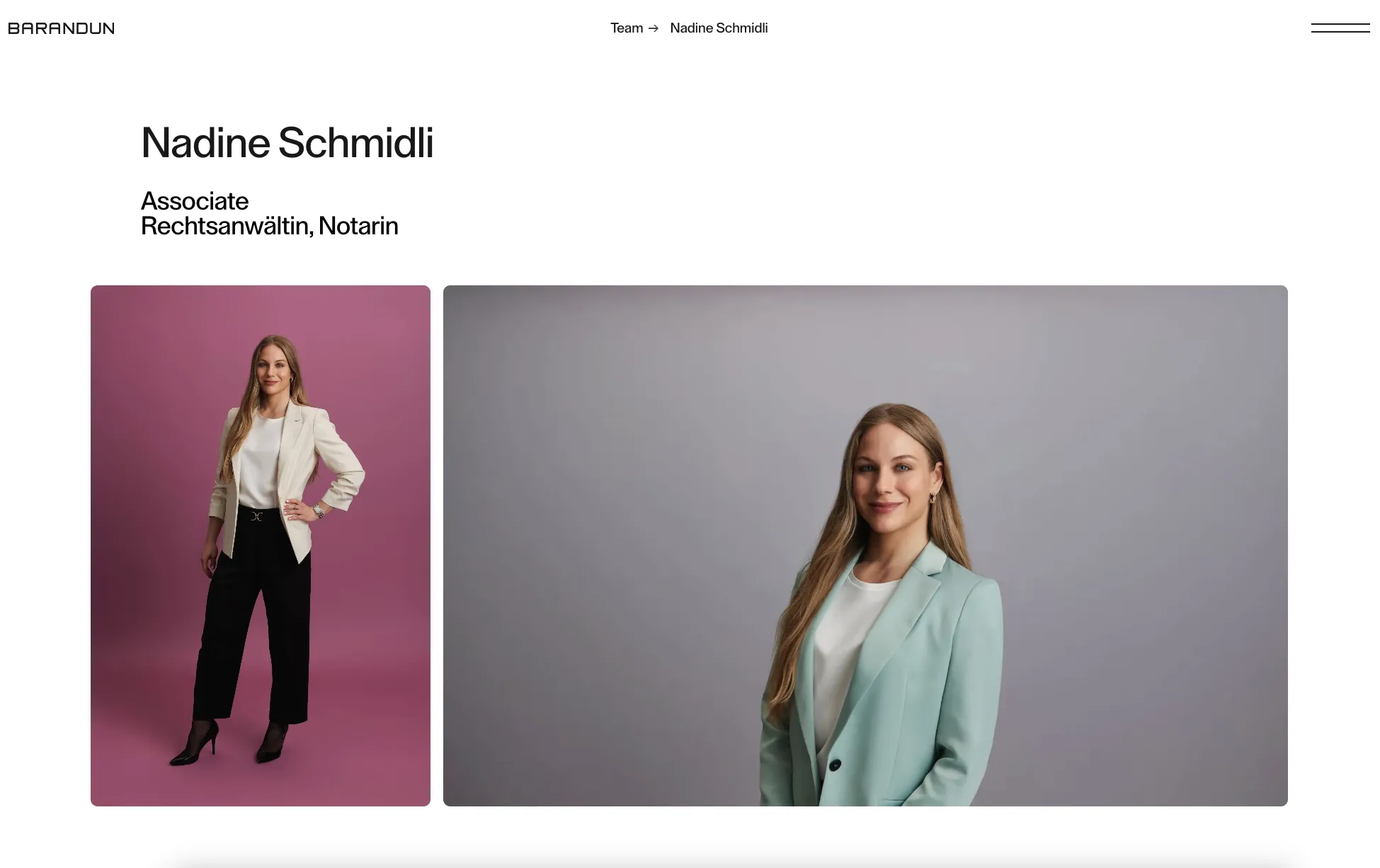 Für den neuen Auftritt fing der Fototgraf Nicolas Burri die Belegschaft, die Büroräume, die Architektur und die Umgebung an der Löwenstrasse ein. Seine Fotografien bilden die visuelle Grundlage der neuen Website: Sie zeigen nicht nur den neuen Ort, sondern auch die Menschen, die ihn prägen. Die Portraits der gesamten Belegschaft wurden prominent ins Design integriert und tragen wesentlich zur Persönlichkeit des Auftritts bei. Es entsteht eine emotionale Verbindung zwischen Raum, Identität und Marke. Die Website übersetzt die Atmosphäre der physischen Räume in ein digitales Erlebnis – klar, hell und offen. Barandun wird als Kanzlei spürbar, die fest in Zürich verankert und gleichzeitig international ausgerichtet ist.