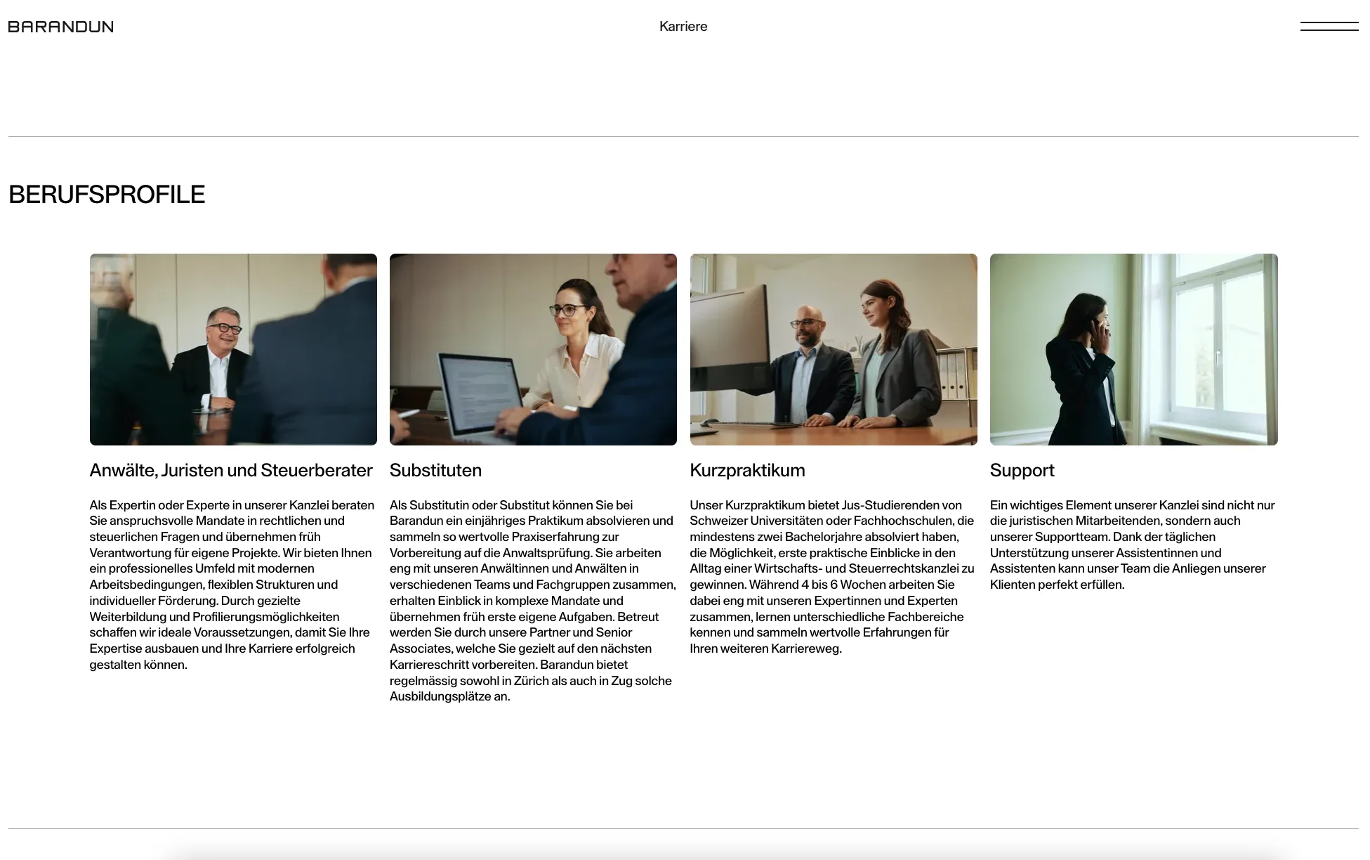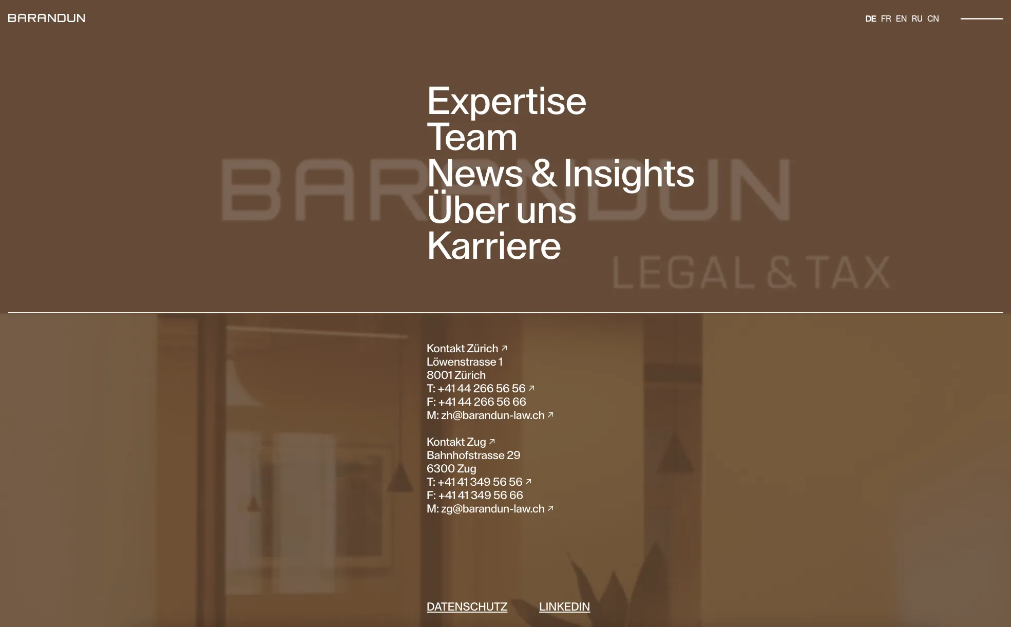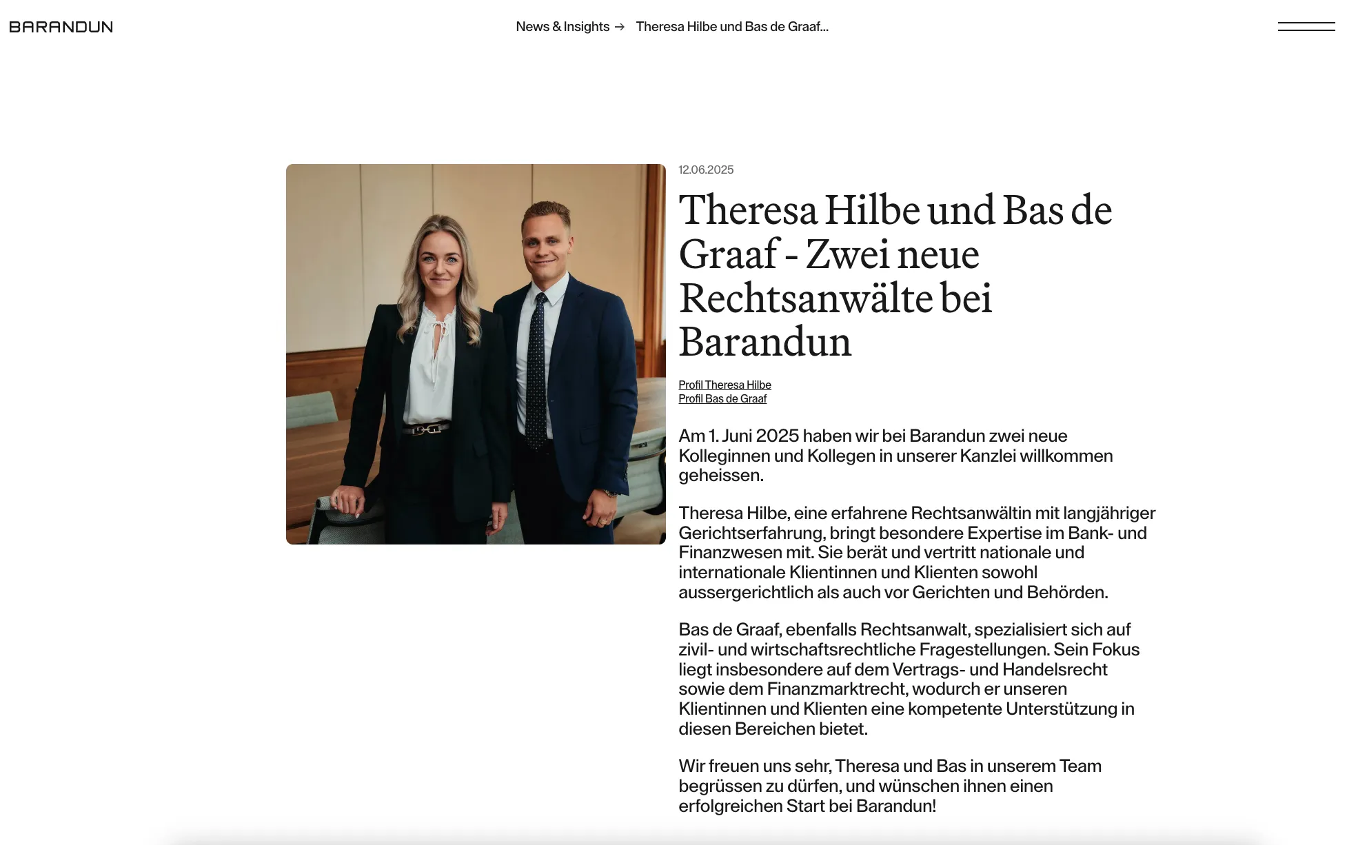 Das visuelle Konzept der Website stammt von Livia Trümpi von anotherstudio.ch, die Texte von unserem Haustexter Thomas Ammann. Unter der kreativen Leitung von Livia Trümpi entstand ein Erscheinungsbild, das die Haltung der Kanzlei präzise einfängt: modern, klar und selbstbewusst. In enger Zusammenarbeit mit Text, Fotografie und Technik entwickelte sich ein Auftritt, der das Wesen von Barandun authentisch spürbar macht: Wir sind Barandun. Die Website übersetzt die Werte der Kanzlei in eine Sprache, die Vertrauen schafft und gleichzeitig eine zeitgemässe Leichtigkeit bewahrt.